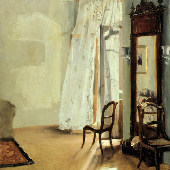 Bathed in delicate morning light, Adolph Menzel’s "The Balcony Room" captures a moment of quiet intimacy within an empty interior. The sunlight filtering through sheer curtains casts gentle reflections across the polished floor, transforming the modest furnishings into a study of light, texture, and atmosphere. With remarkable realism and restraint, Menzel evokes both the serenity and transience of domestic space, elevating the everyday to poetic significance.