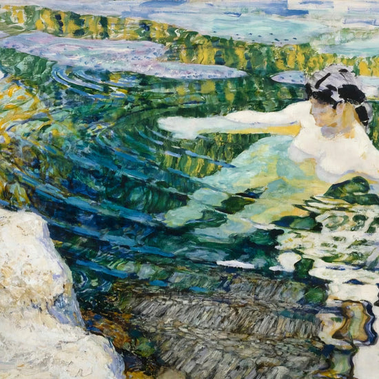 The Bather (c. 1907) by František Kupka exemplifies the artist’s transition from representational art toward abstraction through a masterful study of light, movement, and reflection. Depicting a nude figure partially submerged in water, Kupka dissolves the boundaries between body and environment, rendering the surface of the pool as a vibrant interplay of refracted color and form. The fluid brushwork and iridescent palette of greens, blues, and golds evoke both the sensuous immediacy of the scene and the underlying rhythms of nature. This work stands as a pivotal example of Kupka’s exploration of perception and his early contribution to modernist visual language.