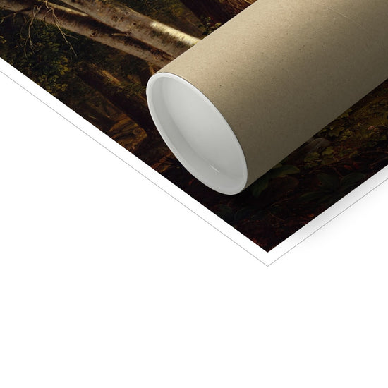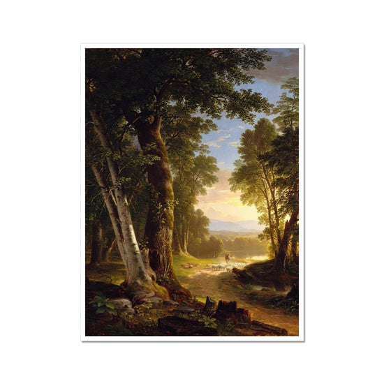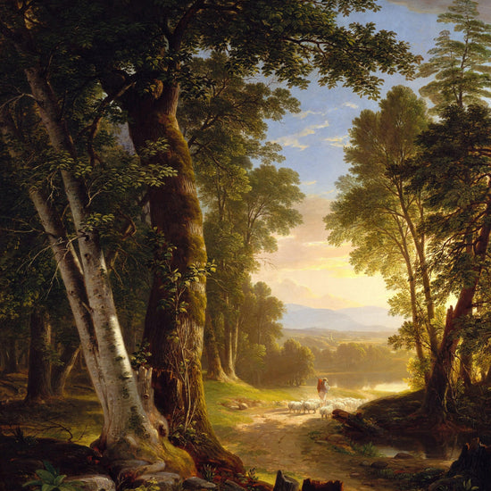 "The Beeches" by Asher Brown Durand, created circa 1845, is a serene landscape painting that captures the beauty of nature with meticulous detail. The scene depicts a tranquil forest path surrounded by tall, majestic beech trees. Sunlight filters through the dense foliage, casting a warm glow on the forest floor. In the distance, a shepherd is seen guiding his flock of sheep along the path towards a distant, sunlit clearing. The composition draws the viewer's eye through the forest, emphasizing the depth and richness of the natural environment. Durand's use of light and shadow, combined with his intricate rendering of the trees and foliage, creates a peaceful and idyllic representation of the American wilderness.