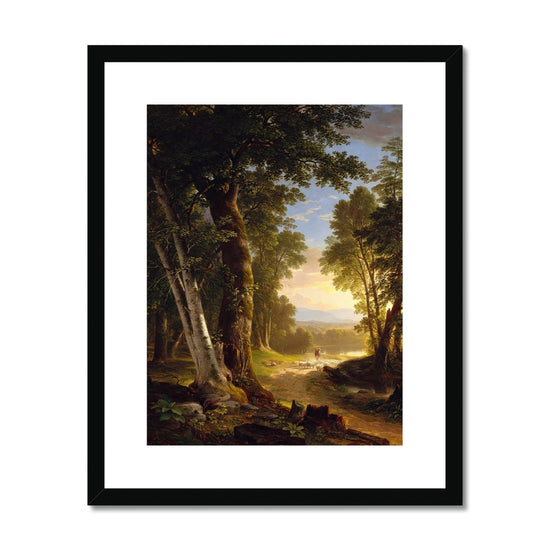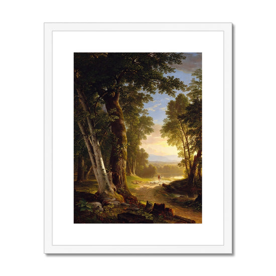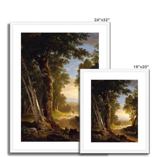 "The Beeches" by Asher Brown Durand, created circa 1845, is a serene landscape painting that captures the beauty of nature with meticulous detail. The scene depicts a tranquil forest path surrounded by tall, majestic beech trees. Sunlight filters through the dense foliage, casting a warm glow on the forest floor. In the distance, a shepherd is seen guiding his flock of sheep along the path towards a distant, sunlit clearing. The composition draws the viewer's eye through the forest, emphasizing the depth and richness of the natural environment. Durand's use of light and shadow, combined with his intricate rendering of the trees and foliage, creates a peaceful and idyllic representation of the American wilderness.