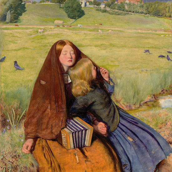 John Everett Millais' The Blind Girl (1856) is a poignant and richly symbolic Pre-Raphaelite masterpiece. The painting depicts two destitute sisters, with the older blind girl stoically accepting her fate while the younger one tenderly gazes at the world she still has the privilege to see. A radiant double rainbow arcs across the stormy sky, symbolizing hope and renewal amidst hardship. Millais’ meticulous attention to detail, from the embroidered butterfly on the blind girl’s shawl to the lush pastoral landscape, enhances the emotional depth of the scene, evoking themes of perception, innocence, and the sublime contrast between light and darkness.