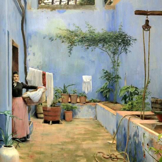 The Blue Patio (1892) by Santiago Rusiñol captures a tranquil domestic courtyard bathed in soft light. Against the cool tones of bluewashed walls, a woman carrying laundry emerges from the doorway, adding a touch of everyday life to the serene setting. Potted plants, a well, and drying linens contribute to the quiet atmosphere, blending intimacy and simplicity with Rusiñol’s refined sense of composition and color.