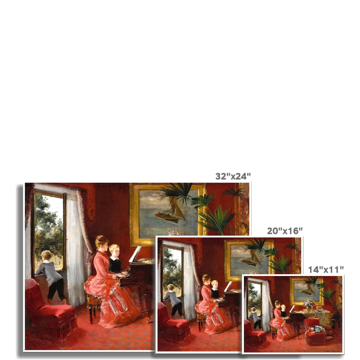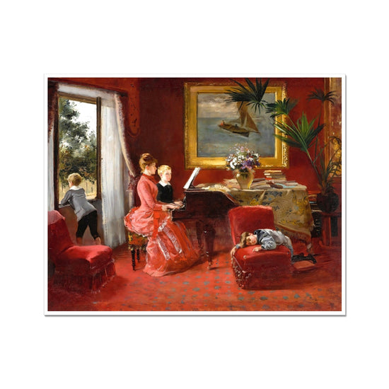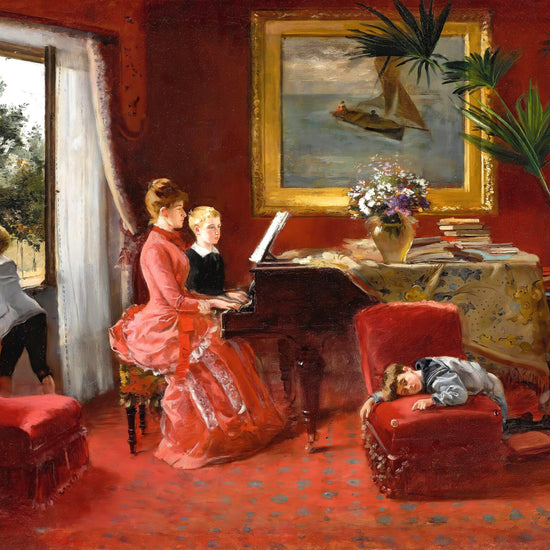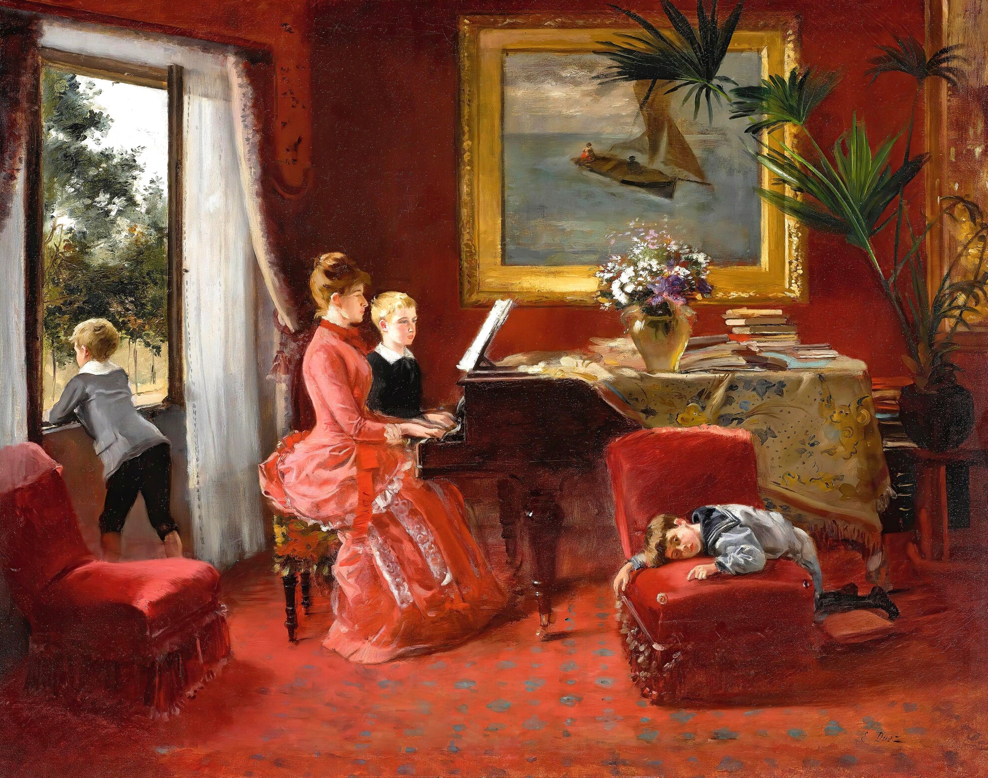 Ernest-Ange Duez's painting The Duet depicts a cozy, elegant interior where a mother and her son sit together at a piano, playing music in harmony. The room is richly decorated in deep red tones, with plush furniture and a large framed painting on the wall, creating an atmosphere of warmth and refinement. Nearby, a young child leans on a window sill, gazing outside, while another child, dressed in a sailor outfit, dozes peacefully on an armchair, adding a tender, familial touch. The scene captures a moment of quiet domestic life, blending art, music, and family bonds in a beautifully detailed setting.