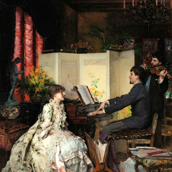 Pascal Dagnan-Bouveret’s "The Duet" captures an intimate moment of refined domestic harmony in the late 19th century. A young woman listens attentively as two gentlemen perform—a pianist and a violinist—within an opulent interior softly illuminated by filtered light. The artist’s meticulous realism and delicate rendering of textures, from silken fabrics to polished wood, convey both the elegance and emotional restraint of bourgeois life. Through its poised composition and quiet atmosphere, the painting evokes the grace, sentiment, and cultivated leisure of the Belle Époque.