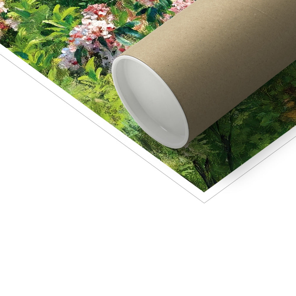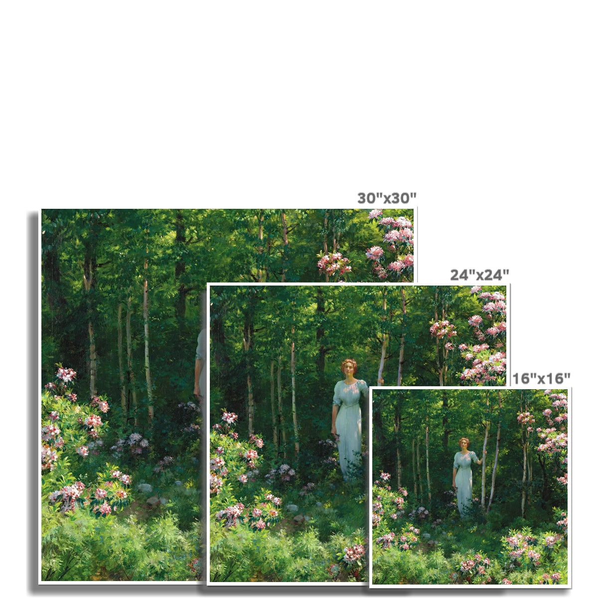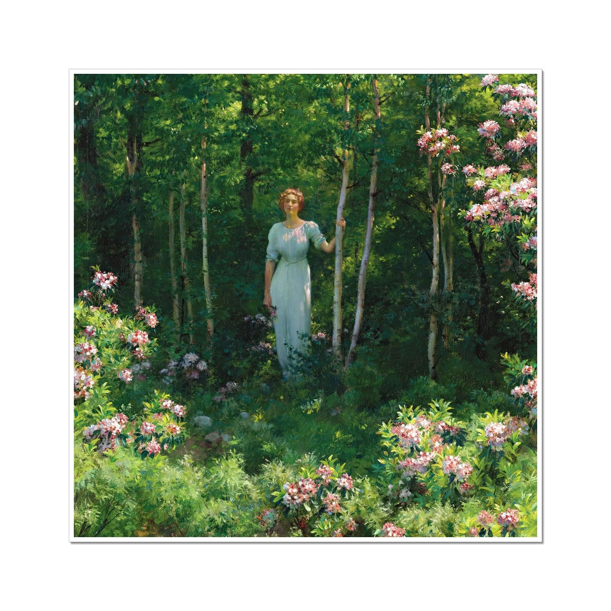"The Edge of the Woods" by Charles Courtney Curran, painted around 1912, is a captivating oil painting that showcases the beauty of nature and the serene presence of a solitary figure. The painting depicts a young woman standing at the edge of a lush, verdant forest. She is dressed in a light, flowing gown that contrasts gently with the rich green foliage surrounding her. The scene is adorned with blooming pink and white flowers, adding vibrant splashes of color to the verdant backdrop. The woman's serene expression and the gentle play of light filtering through the trees create a tranquil and harmonious atmosphere, capturing a moment of peaceful solitude in nature.