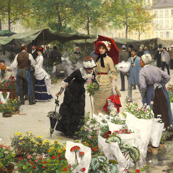 This gorgeous fine art print, The Flower Market by Victor Gabriel Gilbert from 1880, is a tranquil addition to any wall. Its soft colours and delicate brushstrokes evoke a peaceful atmosphere, perfect for your home or studio.