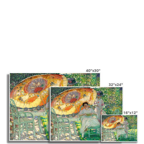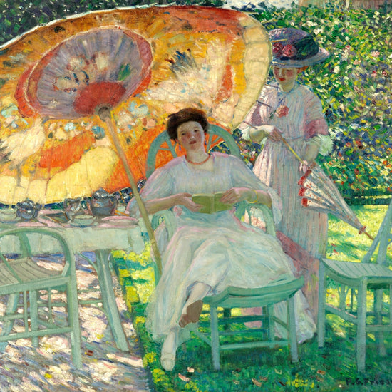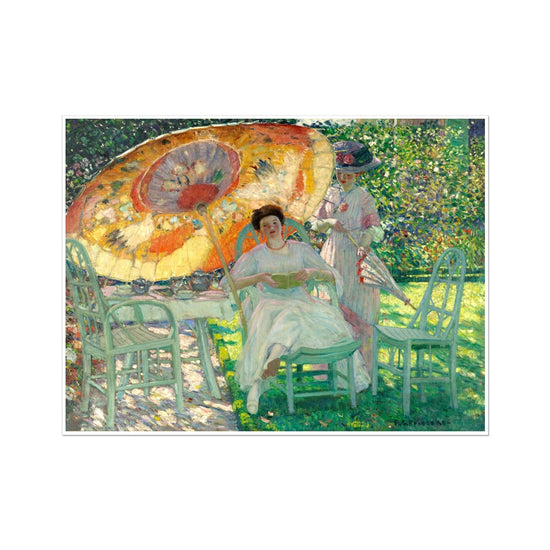 The painting "The Garden Parasol" by Frederick Carl Frieseke, created around 1910, depicts a serene garden scene with two women enjoying a sunny day. The focal point of the painting is a large, colorful parasol that casts a dappled shade over the women and the surrounding area. One woman is seated at a table, engrossed in a book, while the other woman stands nearby, holding a parasol. The scene is vibrant with lush greenery and blooming flowers in the background. The use of bright, impressionistic colors and light brushstrokes gives the painting a lively and cheerful atmosphere, capturing the leisurely and pleasant ambiance of a garden in full bloom.