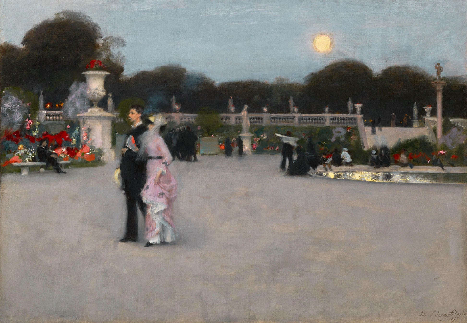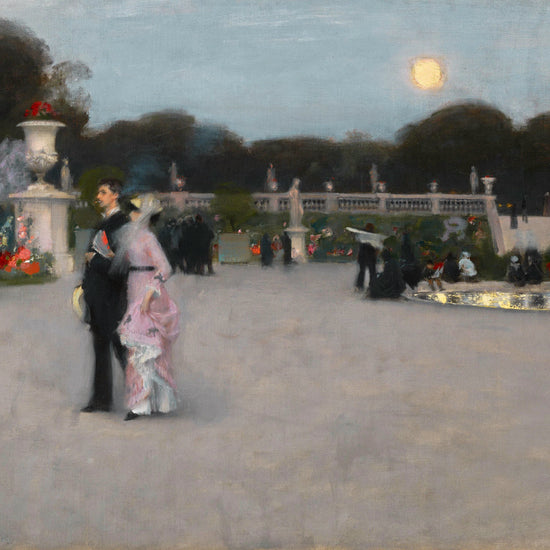 John Singer Sargent’s In the Luxembourg Gardens (1879) is a refined and atmospheric depiction of Parisian leisure at dusk. The scene shows elegantly dressed figures strolling and socializing amidst vibrant flower beds and classical statues, under the soft glow of a rising moon. Sargent’s delicate use of light, shadow, and blurred forms creates a dreamlike, almost impressionistic mood, capturing both the charm of the garden and the fleeting nature of the moment.