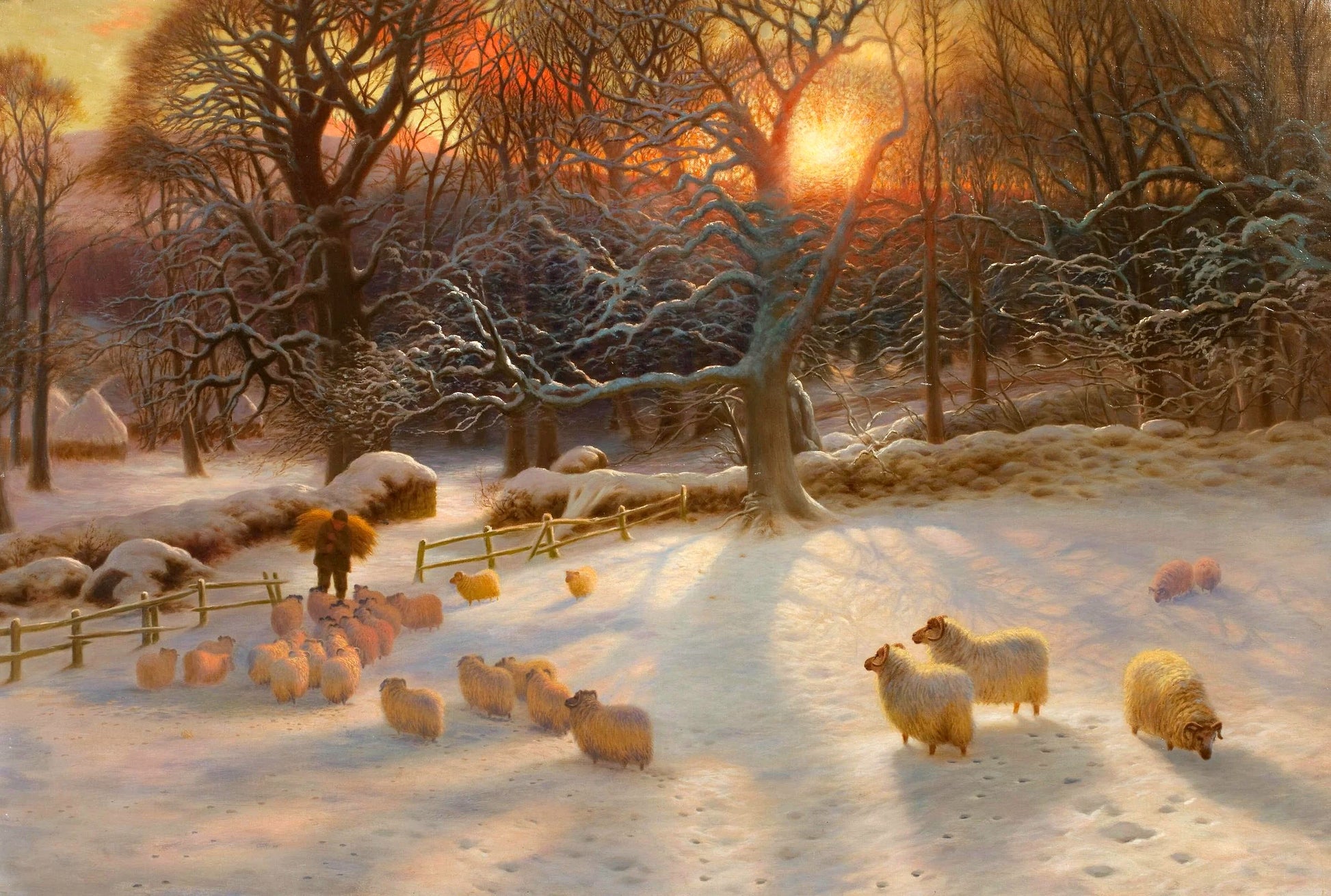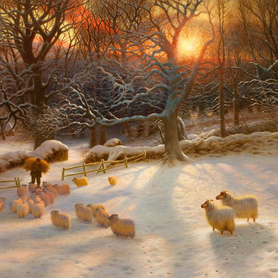 Joseph Farquharson’s "The Shortening Winter's Day is Near a Close" (c.1903) captures a tranquil winter pastoral bathed in the fading glow of sunset. A shepherd tends his flock as warm golden light melts into frosty blues and purples across the snow-covered landscape. Farquharson masterfully balances atmosphere and natural detail, evoking quiet rural life and the poetic stillness that settles over the countryside as daylight wanes in winter.