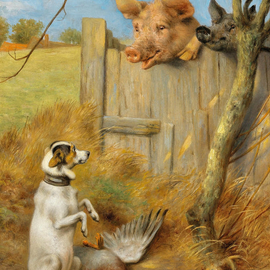 Herbert William Weekes’ The Trial is a beautifully detailed and subtly humorous painting that turns a simple countryside scene into a playful courtroom drama. At its center, a dog sits upright, looking almost guilty, as if pleading its case before two pigs peering over a wooden fence. The cause of the trial? A lifeless duck at the dog's feet, suggesting it may have overstepped its duty as a hunting companion.