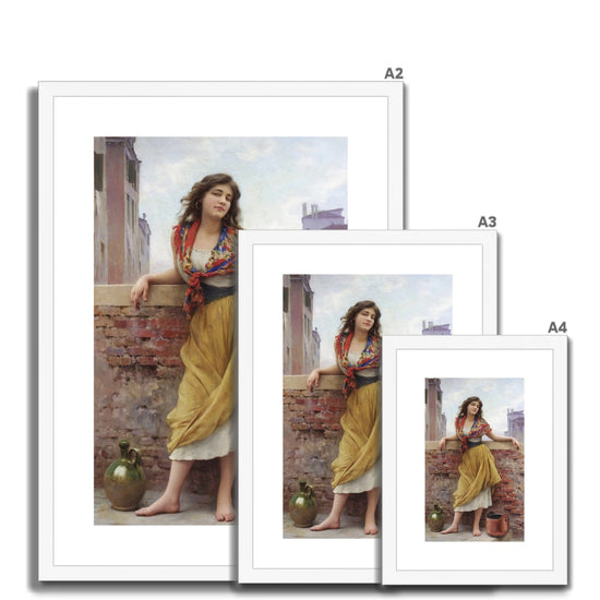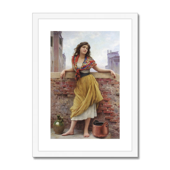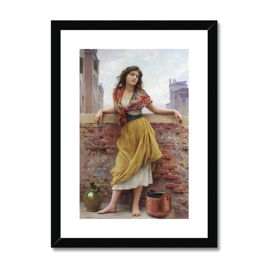 This classic painting, "The Water Carrier" by Eugene de Blaas, painted in 1908, portrays an Italian lady in a peaceful setting. Now available as a beautiful framed print, this timeless masterpiece is sure to be a conversation starter in your home.
