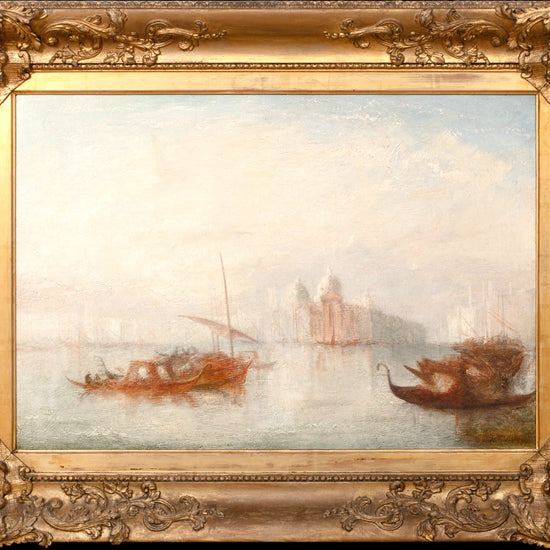 A striking 19th century oil on canvas depicting a sweeping view across the Venetian lagoon toward the Dogana and the Basilica di Santa Maria della Salute, painted in the soft luminosity of dawn. The artist captures Turner’s characteristic atmospheric brilliance: veils of mist, delicate tonal transitions, and a poetic interplay of water and light. The composition retains exceptional clarity and surface condition, and bears a signature at the lower right.