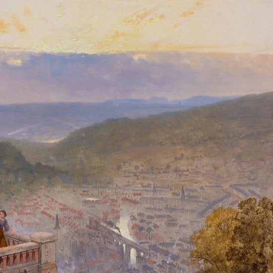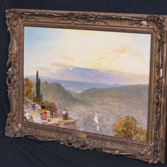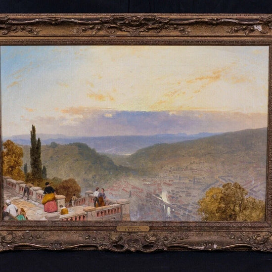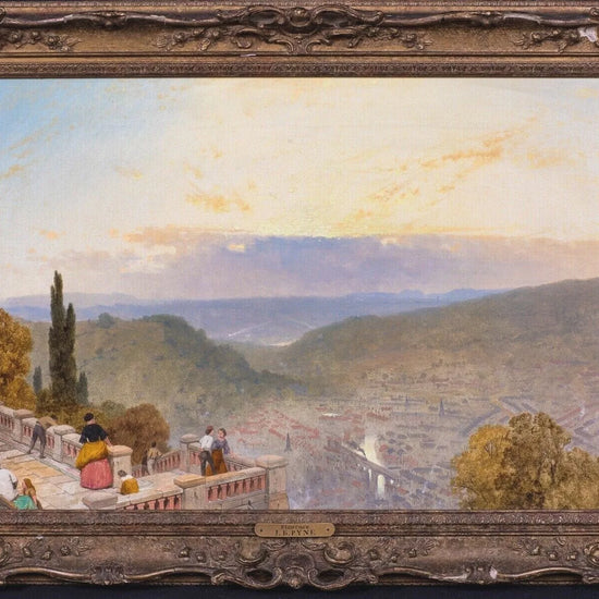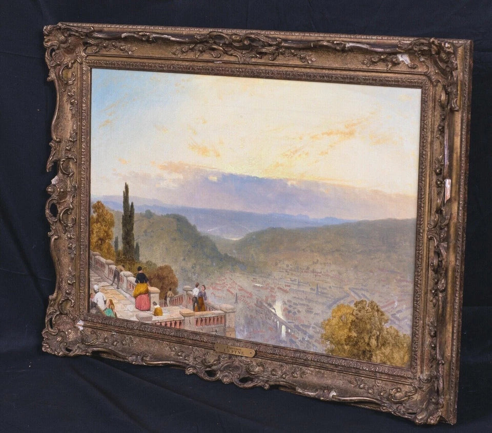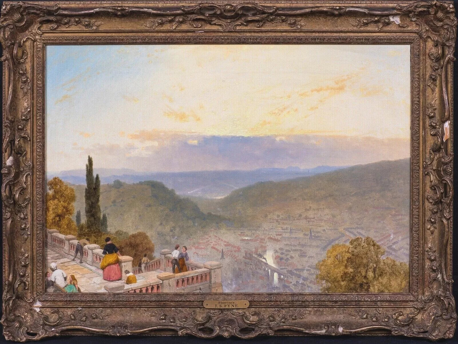 A fine and expansive 19th century view of Florence at sunset from the Church of San Miniato al Monte, oil on canvas by James Baker Pyne. This superb work exemplifies Pyne’s mastery as a leading landscape painter, reflecting the strong influence of Turner in its luminous atmosphere and expressive handling of light. It also represents a rare early depiction of Florence from this elevated vantage point in the surrounding hills. Signed and beautifully presented.