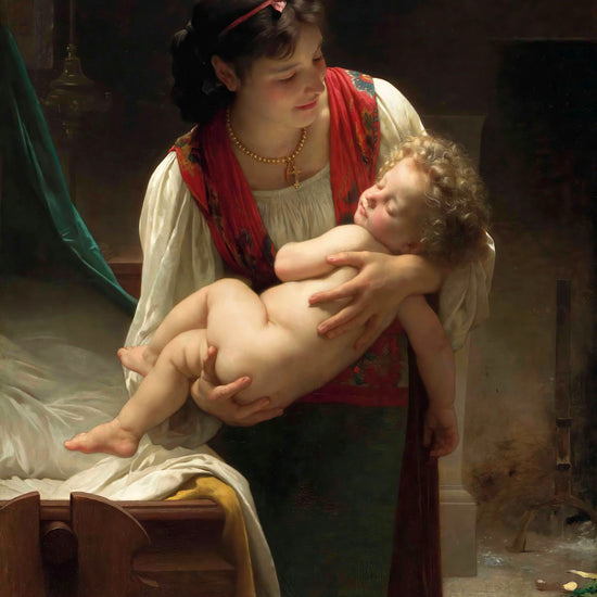 Berceuse (Le Coucher) (1873) by William-Adolphe Bouguereau is a tender portrayal of maternal love and serenity. A young mother gently cradles her sleeping child, her expression filled with warmth and devotion. Bathed in soft, golden light, Bouguereau’s meticulous realism and delicate brushwork elevate this intimate domestic moment into a timeless study of purity, protection, and the sacred bond between mother and child.