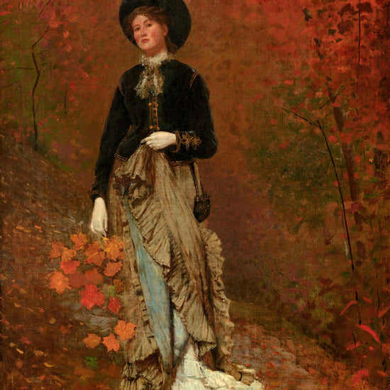 Autumn (1877) by Winslow Homer captures a moment of quiet reflection amid the rich hues of fall. A young woman, elegantly dressed in Victorian attire, strolls through a forest carpeted with crimson and gold leaves. Homer’s warm palette and delicate treatment of light evoke both the beauty and transience of the season, blending natural poetry with a sense of introspective calm.