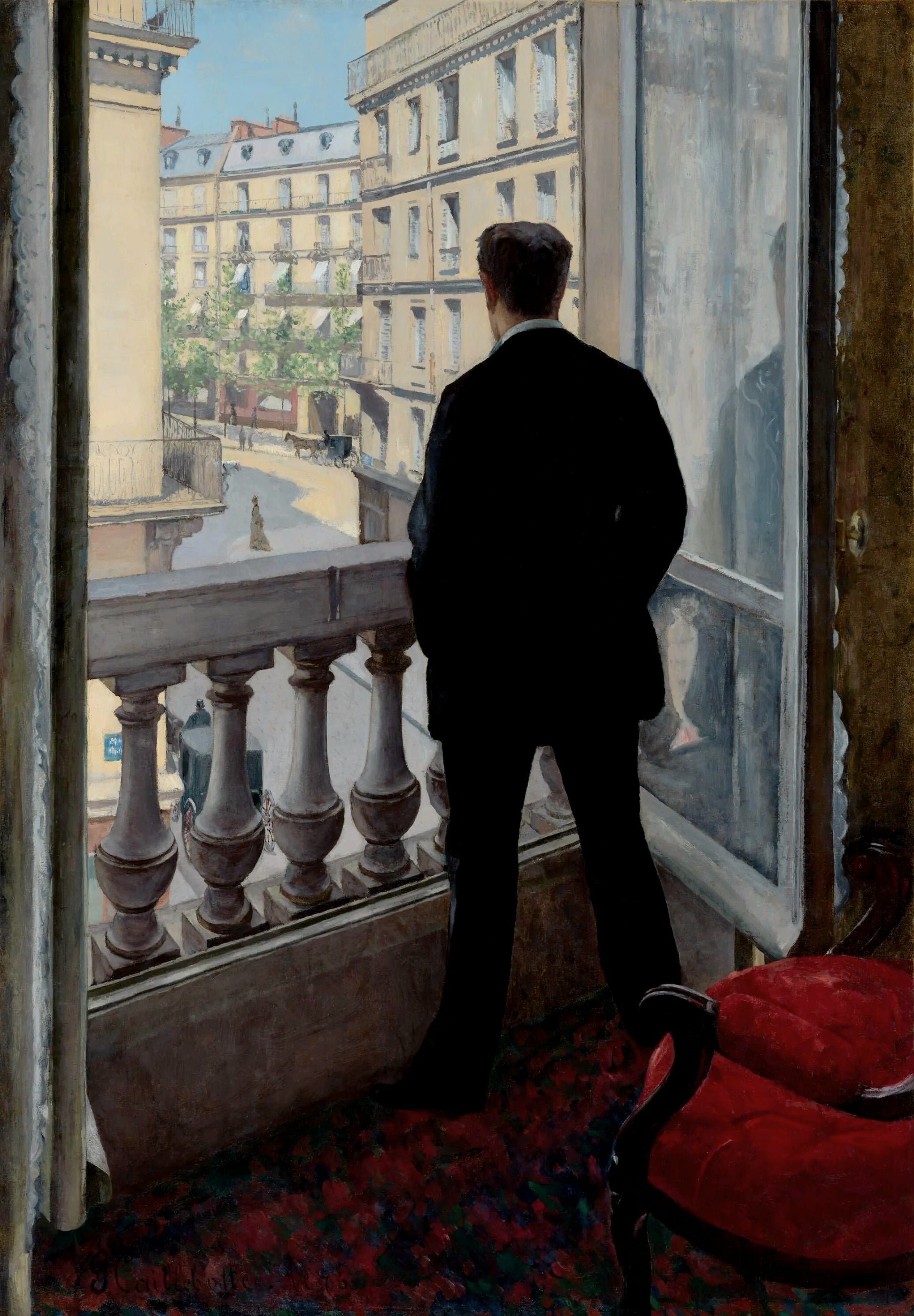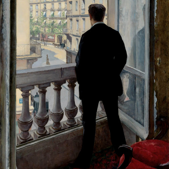 Gustave Caillebotte’s Young Man at His Window (1876) is a striking composition that captures the quiet introspection of modern urban life. A well-dressed man, seen from behind, gazes out from a Parisian apartment onto the bustling boulevard below. The sharp perspective and meticulous detail of the Haussmann-style buildings contrast with the shadowed interior, emphasizing a sense of detachment and contemplation. The reflection in the window subtly reinforces the theme of self-awareness and observation. With its crisp realism and psychological depth, Caillebotte masterfully conveys the tension between isolation and engagement in the ever-changing cityscape.